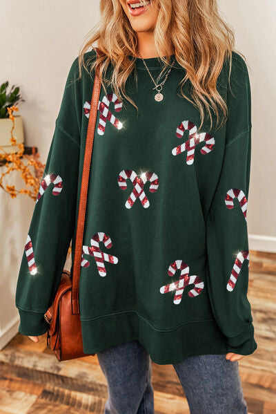 Candy Cane Sequin Round Neck Long Sleeve Sweatshirt